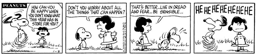 当露茜看到史努比手舞足蹈得意忘形,便指责它没有恐惧感和不安感,而史努比便故意装出害怕的样子嘲弄了一番——这实际上是化用了1966年1月8日的《花生漫画》情节。