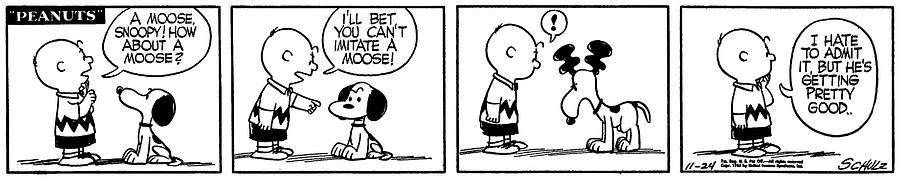 而在扮演企鹅的爬坡尝试失败后,史努比便以驼鹿的姿态再次攀登山坡,这一形象原型出自1955年11月24日的《花生漫画》。
