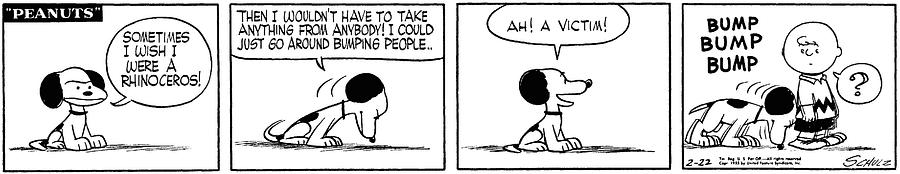 模仿犀牛的形象是出自1955年2月22日的《花生漫画》,而在早期的漫画中史努比的话语表达是在对话气泡????和思考气泡????中摇摆不定,一直到1960年前后才固定使用思考气泡作为表现其所思所想的核心形式。