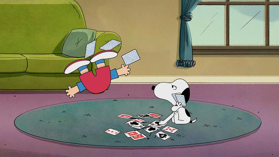 在这其中,史努比和礼让在完成为露茜跳绳的任务跑路后,两人便在范佩特家的客厅玩起了扑克牌游戏——这部分情节是出自1997年7月20日的漫画内容。
