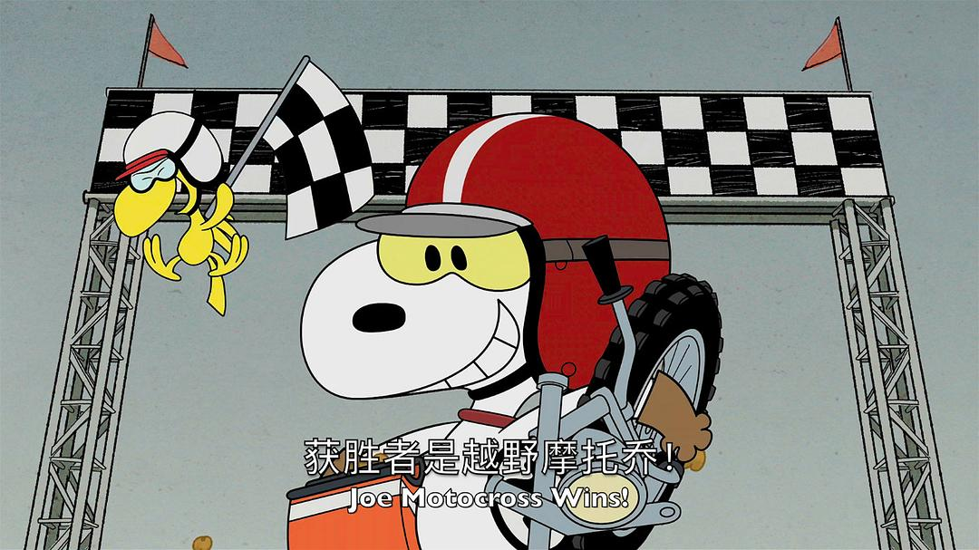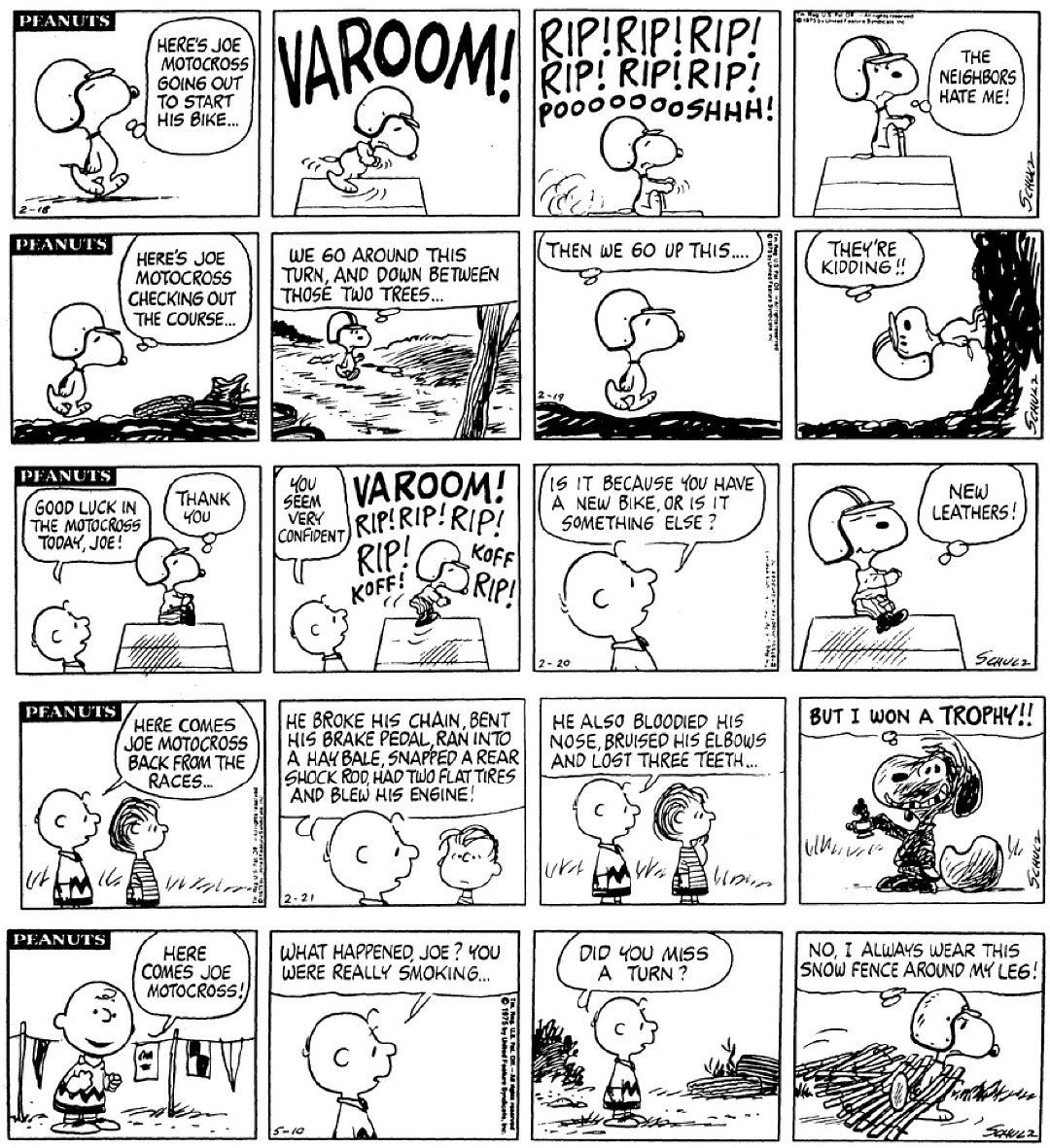 在这一章节中,史努比借助查理·布朗的妹妹莎莉新买的自行车,幻想自己是所谓的“越野摩托乔”(Joe Motorcross)出现在越野摩托大赛上。而在《花生漫画》原作中,这一幻想情节的原型出现在1975年2月18~21日连载的内容中,但和改编动画相比故事则是凄惨不少: