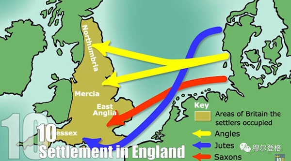 大概可能与亚瑟王生活时代重合,各种部落的日耳曼人从现在的尼德兰地区出发渡海入侵,盎格鲁人(Anglo)占领了北部的诺森比亚(Northumbria)并把东方命名为EastAnglia,撒克逊人(Saxons)建立了南部的几个赛克斯国(Wessex,Sussex,Essex),Jutes占据了Kent,弗里斯人(Frisii)成了各部落之间的商人。我们现在都知道英语是由一种德语方言演变来的,可能是由于弗里斯商人们负责了各类交流,语言学家们表示与现代英语最接近的语言还是弗里斯语。
