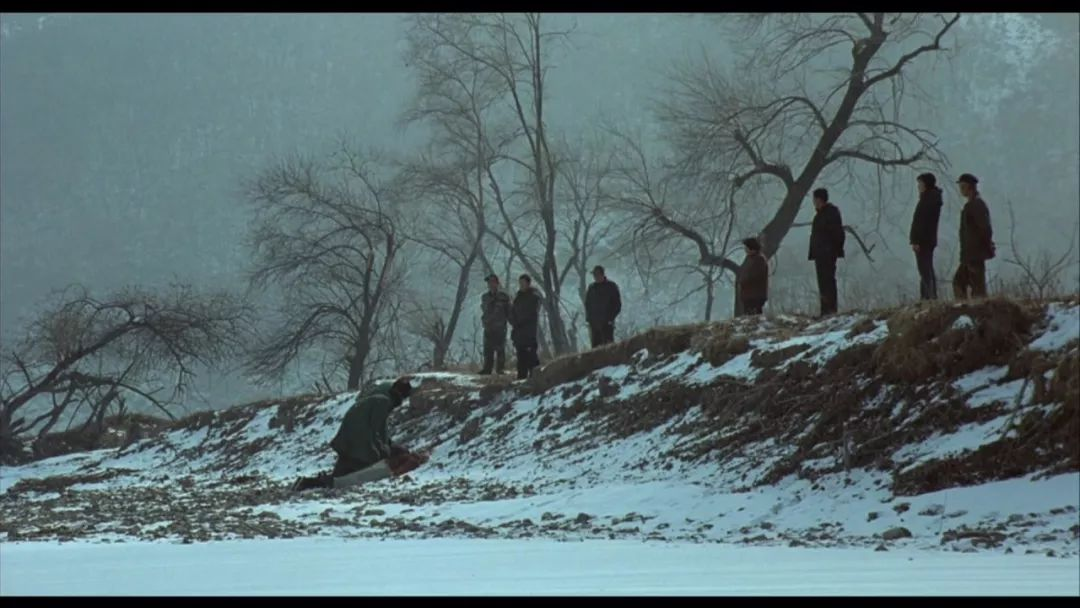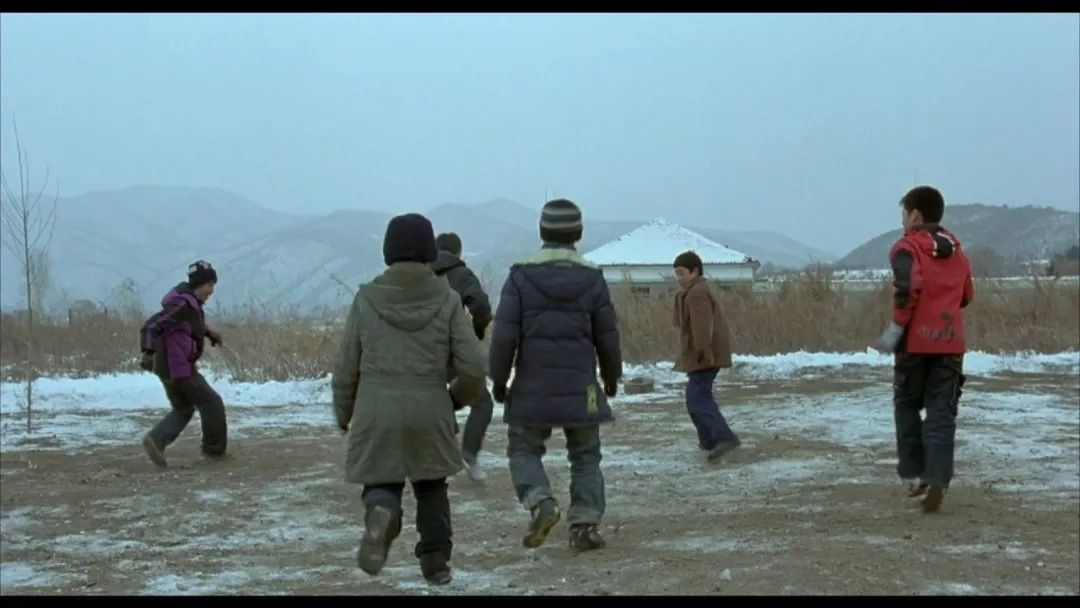 但影片很让我意外,它平淡冷寂,大雪覆盖着山脉与土地,图们江被冰雪封盖,在这片宁静的有些荒芜的村庄里,人们的生活也如停滞一般。小卖店门口永远有两个大老爷们在灌酒,爷孙三人吃饭的场景重复了一遍又一遍,仿佛是一顿永远吃不完的饭,老爷子像是活到了时间墙外,无论是面对脱北者的求助,还是面对孙女秀珍怀孕的事实,表情都一如往常的风平浪静。这里唯一的生气,可能就是孩子们的奔跑与玩闹。然而,这包裹着影片里整个世界的宁静和冷冽的背后,却是那么多的不为人知。男主角昌浩和小伙伴们,这些半大小子看着卖豆腐的女人同男人偷情,还有脱北者强暴给他饭吃的秀珍,总帮着脱北者进入中国的男人最终被铐走,这一切表现的是如此的自然和平常。一切都发生在这看似平静的村子里。导演近乎毫无修饰的呈现了这一切,这其中几乎没有什么个人的情感倾向和道德批判,有的仅仅是寻常。他用“太阳底下无新事”的角度,通过一个个的细节和事件,慢慢表现出了朝鲜族对朝鲜人复杂的态度。