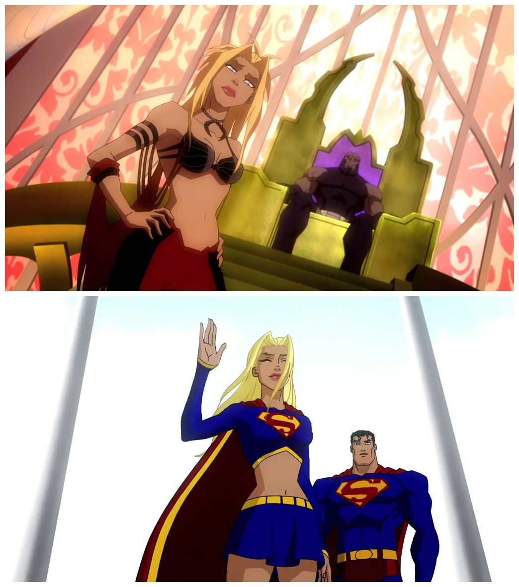 按照《超人与蝙蝠侠:启示录》上映的年份,超级少女应当遵循的是超人堂姐的设定,不过在片中没有刻意提到这一点,而且就相貌与心智来看活脱脱就是个小女孩,因此权且把她看成超人的堂妹也无不可。在影片中,超人也更多扮演着大哥哥的角色,将其视为唯一的亲人而宠溺有加,不仅陪她逛街买衣服鞍前马后,还在她犯错的时候一味护短,让人觉得贵为超人亦有平常人的一面。