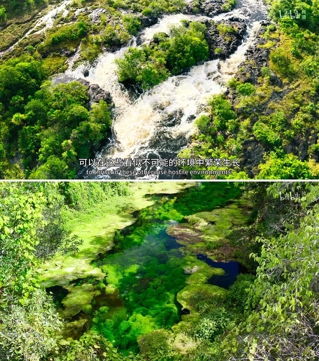 原来蘑菇不是动物也不是植物,而是真菌的子实体。原来植物界竞争也这么激烈,也有植物会头偷竞争者的养分,释放毒素伤害对方……以前还说下辈子投胎做植物,原来做啥都不容易。nn树干光滑通过释放毒液保护自己,但是也吸引了大量来筑巢的鸟,鸟粪中的毒素又毒死了自己的根。nn老了长不动了,靠掉落的种子,可口的花蜜,(直径一米的凯氏大王花吸引丽蝇)都是为了繁殖下一代。nn2.水下植物抢阳光(水面空间)。水下的虹河苔,卡诺,克瑞斯塔莱斯河,最美河流。世界上最大的内陆水世界是潘塔纳尔湿地。亚马逊王莲直径能达2米。鹅吃湖藻。热带雨林高山,藻泽地缺营养吃昆虫(叉叶茅膏菜好美、第2集31分捕蝇草散发甜美的香气瞬间让我想到人类世界的女性)。希氏石脂鲤 ,可以从水底下跳起来,吃树上的果子。