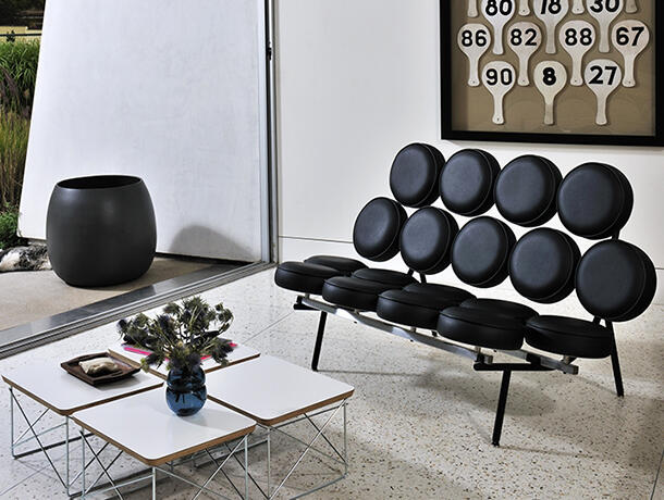 最初的设计灵感来源于尼尔森和设计师 Irving Harper接触到了一位发明家,发明了一种可批量生产的注塑塑料圆盘,生产成本低廉且经久耐用。设计师将18 个圆盘布置在一个钢架上——成为了棉花糖椅的雏形。有人说这沙发形状特别,圆形仿佛飘在空中,却令人意外的十分舒适。