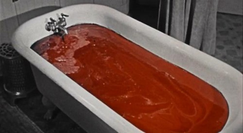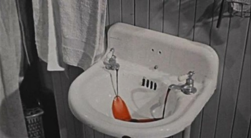 电影开场时导演William Castle站在银幕前所做的这段开场白很难不让人想起另一位惊悚片大师胖子Hitchcock的电视剧场。不同的是,Hitchcock的开场白是留给观众的小谜题,一道开胃菜,而William Castle的开场白更像是一种警告(看过电影后大家才知道这全是盘算好的阴谋)。如果我们假设Hitchcock的电视剧场是在电影院放映的,那么我更愿意做这样的推断: