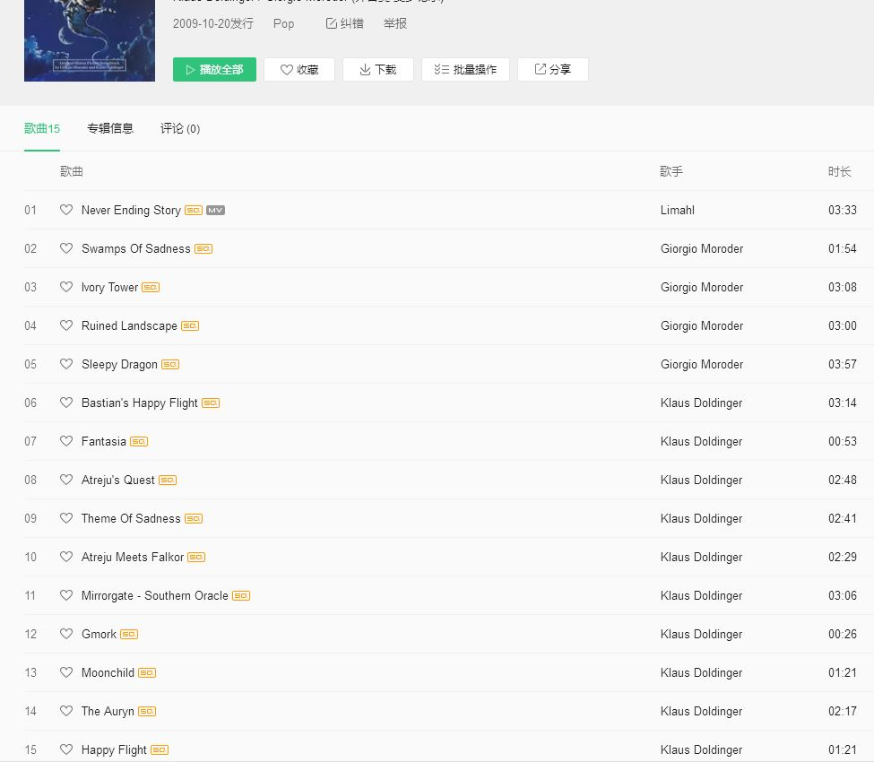 国际版原声的曲目顺序并不是按照电影里曲目先后顺序的,而是Giorgio Moroder创作的在前,Klaus Doldinger创作的在后,上图可以看出qq音乐详细标注了不同作曲,区分的非常清楚:即包含主题曲的前五首是Moroder所作,其后是Klaus Doldinger所作。