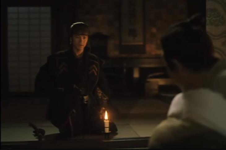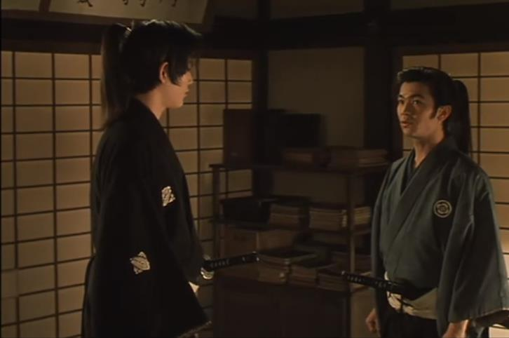 近藤和土方一致看好加纳和田代。近藤一转头,不情愿的喊出伊东的名字,镜头此时才把隐藏的伊东让出来。原来高坐在裁决席的还有一个一直没有发言的第三人,此时的镜头正对的墙壁上,分明写着新撰组的Org Chart:近藤,土方,伊东。伊东一开口,便是和大哥二哥唱反调。不过说了也白说,不用近藤开口,土方颇不耐烦的驳斥了他并直接宣布了结果。伊东的意见,犹如他一开始的就不被镜头所关注一样,是多余的。组织的结构,和组织的矛盾,从这几个泥塑木雕的男人身上体现,新撰组的威严压迫全在于此。