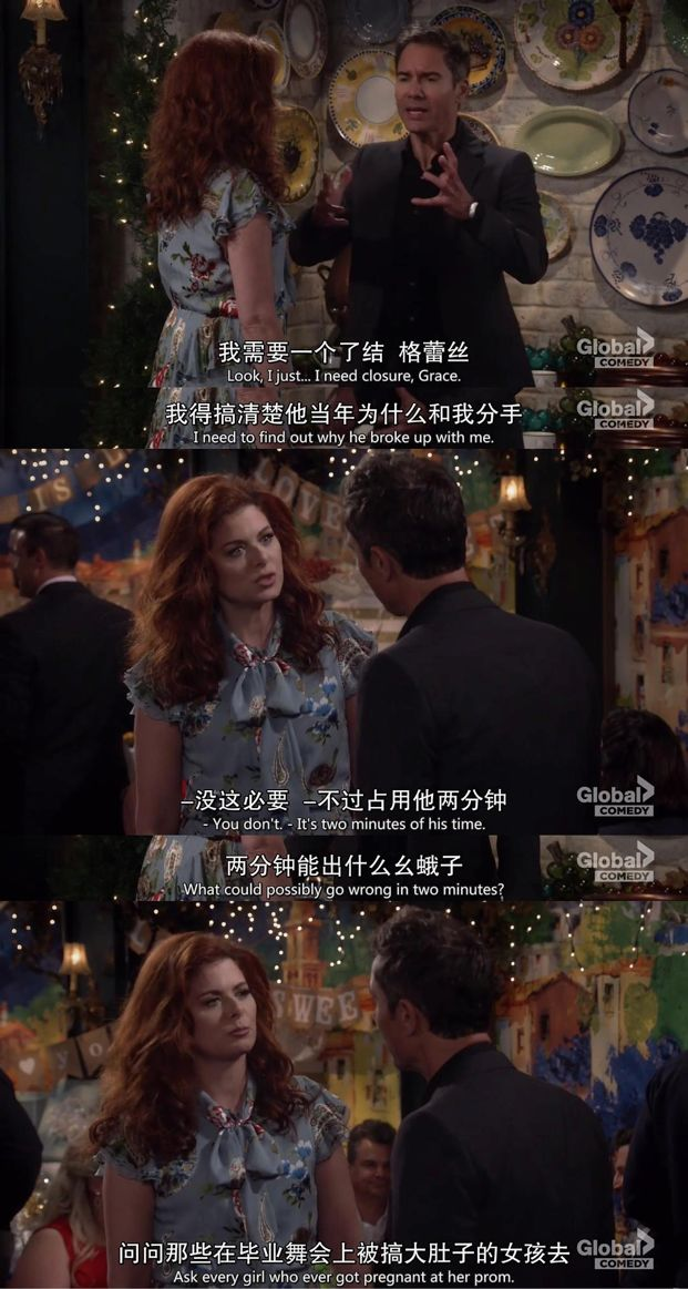 回到剧里,我最喜欢的人当然是威尔,我在威尔身上看到了越来越多老友的影子,难怪他会说我是格蕾丝,因为他首先是威尔。威尔有很多特点,他是一个付出型的人,始终照顾格蕾丝和杰克,不计较得失;他是一个传统的、念旧的人,向往稳定的关系和家庭生活,很难忘掉一个人;他不是工作狂,但是事业有成并且多金;他不喜欢体育,但是坚持锻炼保持身材,穿衣挑剔;甚至他跟Michael在一起七年后分手……方方面面,我的老友简直就是威尔。如果还有那么一点点的差别,我希望他也生活在一个说起性取向就像说起馒头米饭一样自然的社会里。至于我,我当然是格蕾丝,那个自私的、小气的、神经的、大条的、想要幸福的格蕾丝。格蕾丝是这段关系里的索取者,威尔陪她度过了每一段人生低谷,甚至为了跟格蕾丝一起养大她的孩子,愿意放弃自己的幸福。然而反观格蕾丝,每当她有一点点幸福的机会,在威尔和幸福之间,她每次都选择幸福。看到她第二次想为了Leo想放弃威尔的时候,我恨不得冲进剧里去摇醒她,人怎么可以这样没良心啊……可是如果是我,如果是我有一点点幸福的机会,我会不会想去争取呢。仔细思量了一下,我想我也会,因为他们各自找到幸福,一直都是我觉得最好的结局。威尔和格蕾丝的情谊,代替不了亲密关系,就算幸福此刻没有到,也永远不能放弃追求幸福的努力。若干年后再聚首,你是白发,我是老媪。这才是我们的完美ending.