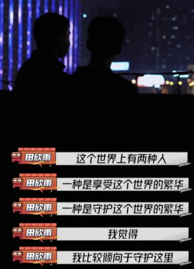 节目中,田副班长说:这世上有两种人,一种是享受世界繁华的人,一种是守护世界繁华的人,我更倾向于后者。
