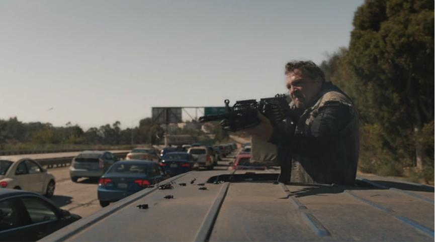 在第三季第6集中,巴瑞被一群摩托暴徒追杀,他淡然地骑着摩托车横行在洛杉矶的大街小巷,冷静的跟拍镜头像极了GTA5里的玩家视角,巴瑞躲进一家窗明几净的二手车行展厅,在洛杉矶梦幻的夕阳下,暴徒骑着摩托车冲上车行屋顶,我们站在远处,静静看着暴徒如末日骑士一般,他的剪影对着脚下的车行天花板疯狂扫射,没有任何配乐,平滑的长镜头远远地、静静地铺展出美与恐怖。