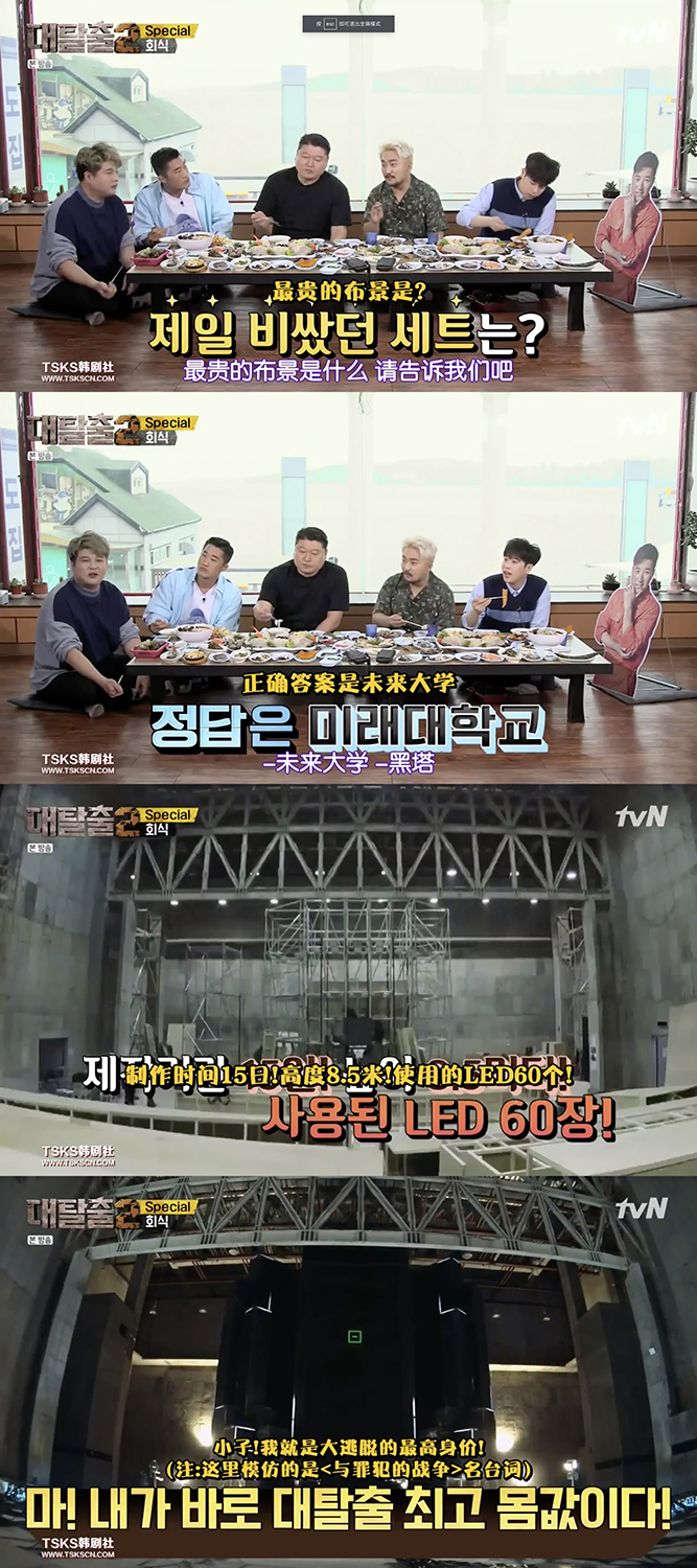 这么猜是因为——n图2-5团魂组和脑男组待在监狱的同一个地方,可以看到n1.摄像头安装的位置不同;n2.墙壁上挂件的位置不同;n图6-8是两组逃出的环境位置,可以看到n1.是同一栋,高层建筑;n2.定点拍摄的镜头没有移位,这点截图叠一起看比较清楚;n所以……我就做了上面的猜测,并再一次,佩服tvN的经济实力(???