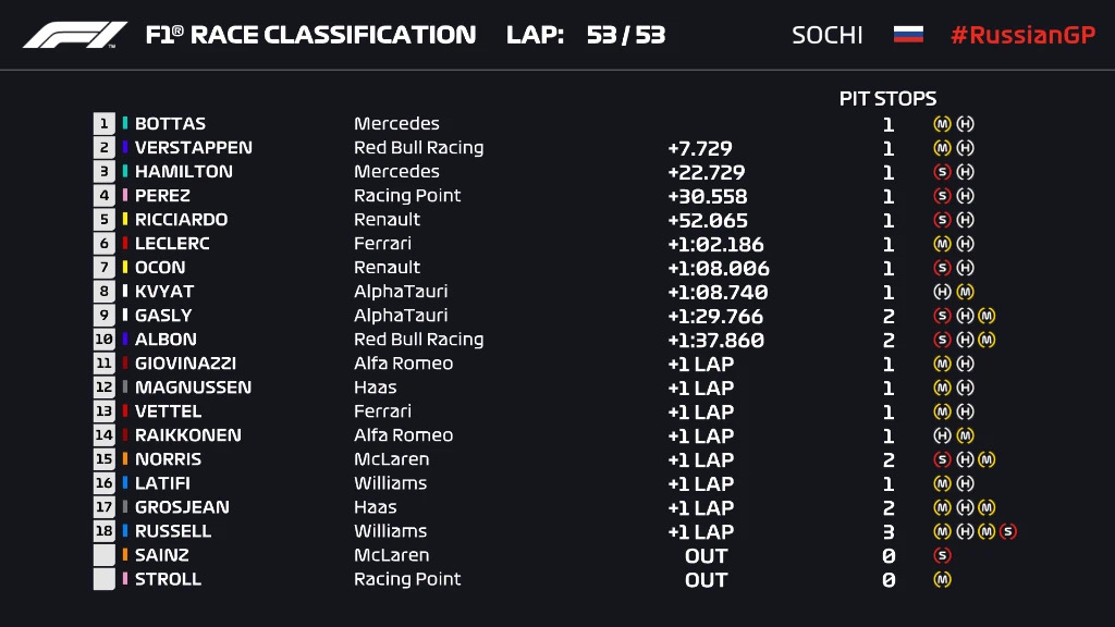 比赛的其他时间在平静中度过,汉密尔顿夺冠,博塔斯和维斯塔潘分获二三。