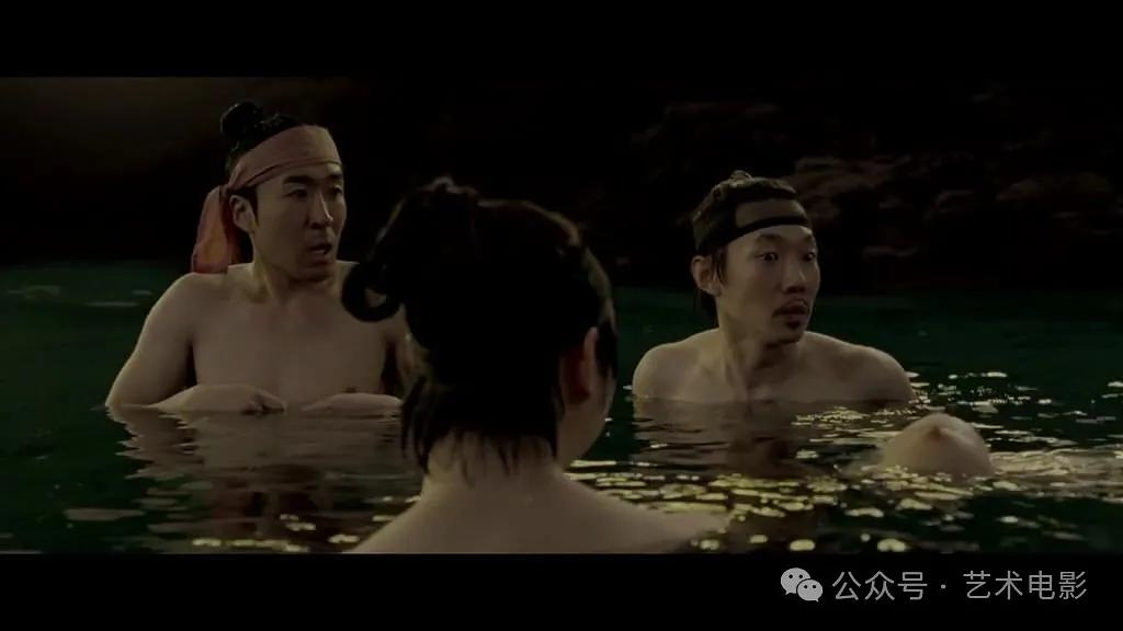 虽然铁子没说到底什么是爱情,可我们都能看得见铁子和大哥姜木初见达耕时惊为天人的表情,那种对泛着单纯的美的向往。尽管后来“眼角的湿气,唇边的红记”这样对达耕的描述是从村里的一个普通市井嘴里冒出来的,但如果说真正被这些所吸引的,就只能是那个依然活在裤裆火灾阴影中而有欲无能的铁子。别人是去看洗澡,只有铁子是去看达耕。按理说既然排除了男女主角单纯对肉欲的渴望,下一步就是像童话一样从此公主王子幸福地生活在一起,可惜按照国际惯例,编剧往往不能让怀有纯情的一对壁人立马得逞双宿双飞,对了谢谢您提醒这还是个韩国片,于是姜木的英雄救美且随即与达耕订婚的残酷事实为铁子和达耕之间的纯情加了一道厚实的看门闩,再加上铁子一个人单枪匹马和全村的女人干柴烈火酣斗一晚,第二天起床还看见达耕面对着满院子的谢礼嘤嘤而泣,看起来铁子和达耕是彻底没戏了,但是我想说,这依然不影响铁子对达耕的一片纯情,导演和我的想法应该也是一致的,否则他也不会特意动用一个硕大的特写镜头交代给大家,这事儿不怪铁子的纯情不够坚定,都是月亮惹的祸。