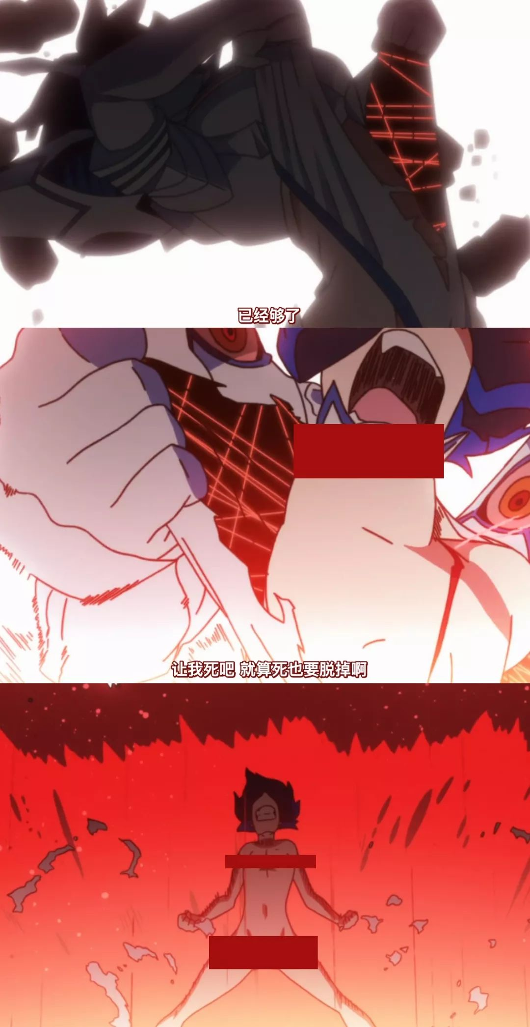 说一下我的猜测,为什么缠流子的神衣鲜血有一只眼睛是瞎的,因为她的父亲的一只眼睛也是瞎的,这个神衣鲜血应该父亲的化身,而鬼龙院皐月的神衣纯洁所谓的新娘妆,应该是母亲的化身。为什么缠流子是“人衣一体”而鬼龙院皐月是“人衣压倒”,恐怕对自己父辈的认同性也有很大的关系。