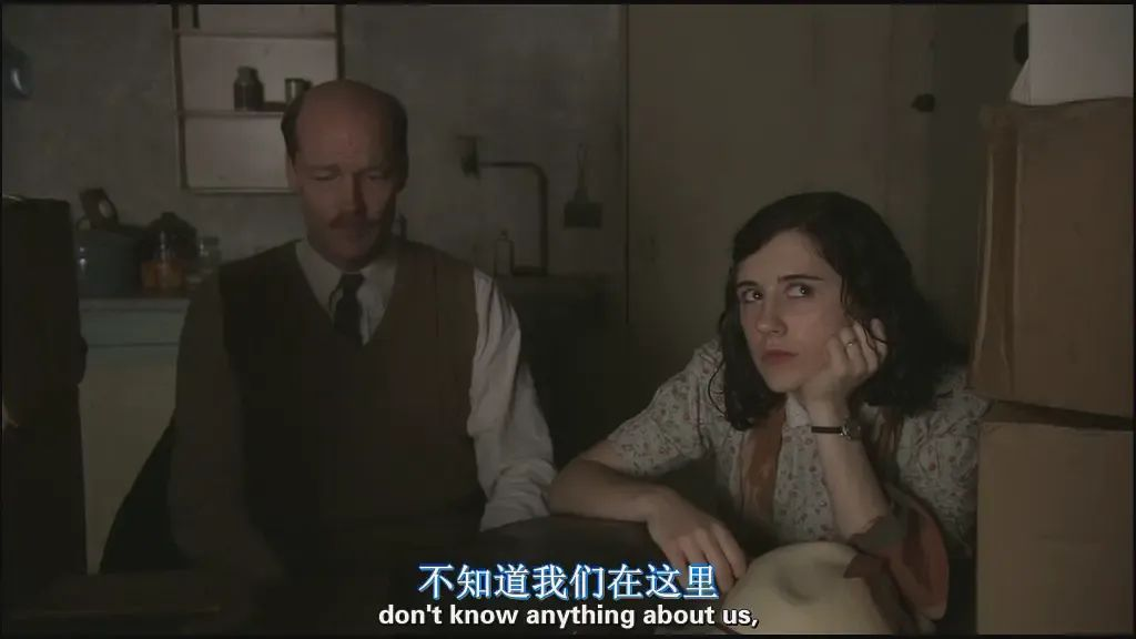 全剧中最令人感动,情感最丰富的是第四集,医生跟妻子之间依靠通风管道传达的爱意,轻轻俯身趴在地面的动作既是对妻子的不舍,也是对以前安稳生活的期盼。一位不得不将孩子交给别人抚养的母亲,从看照片到悄悄远望,再到忍不住冲向自己的孩子,这是贪婪的表现,也是母爱的展现。梅普和闺蜜间因为纳粹的争执,你可以称赞梅普心中的大义,也可以说梅普过于执拗,显然这不是关于站边的问题,闺蜜的选择是面对现实、活在当下,梅普的选择是更多的是“苦在当下”。这几段关于爱情、亲情、友情的刻画不是剧情的全部,但差不多就是这部剧的内容方向。