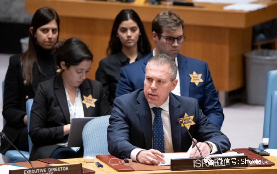 上个月月底,以色列常驻联合国代表吉拉德·埃尔丹(Gilad Erdan)再对联合国发难。在当天的联合国安理会会议上,他当众戴上象征犹太人遭纳粹迫害的黄色六芒星标志,上面写着“NEVER AGAIN”。