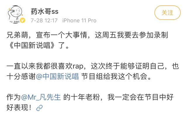 此前,药水哥在微博上发布自己参加比赛的消息,自称吴亦凡十年老粉,还和新说唱官微搞起了互动,放话"看我的freestyle就完事。"