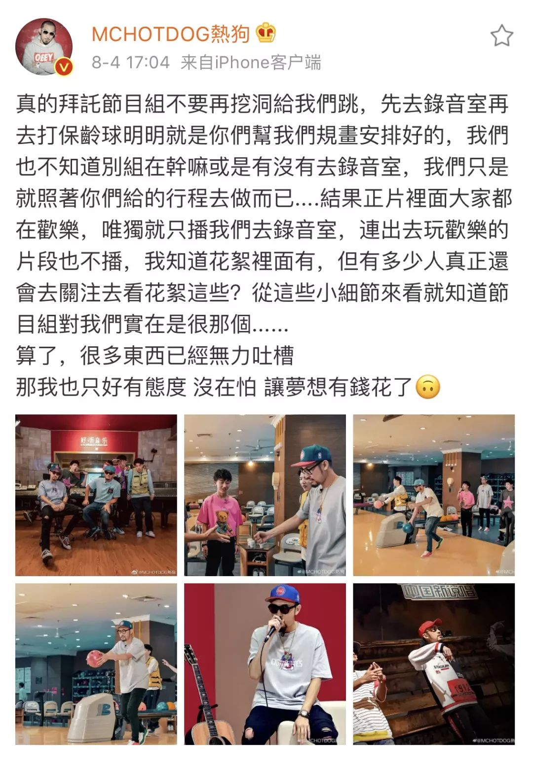 而正在网友与粉丝们一致向节目组发出声讨之时,第二天的狗哥竟又发了一条有关节目的微博,而这一次却再也不见“牢骚”与“酸”,而是换成了一种为自己“昨日言行的澄清”,字里行间透露着对节目组的认可与支持。