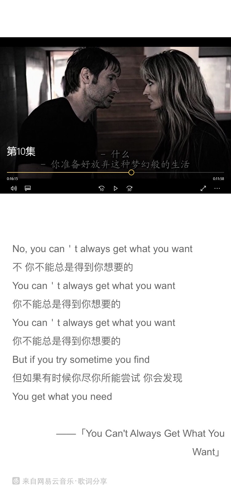 第四季季终集第12集临近结束的时候,响起的是曾经收录在第二季原声碟里滚石乐队的《You can’t always get what you want》。因为之前这首歌已经在自己的歌单里轮回出现了多次,所以如同唱诗班般的和声“I saw her today at the reception...”出现的瞬间,我便明了到头来这还是在阳光温暖众生淫靡的加州的一个轮回。