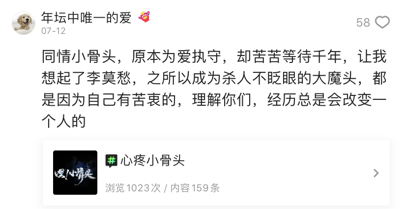 球球赵珈萱饰演的小骨头颠覆了以往的“白骨精”形象,而是化身为一位对爱情充满憧憬、勇敢为爱牺牲的少女,用心守护她与渣渣之间的情感。相爱却不能相守的故事也戳到不少观众的泪点。