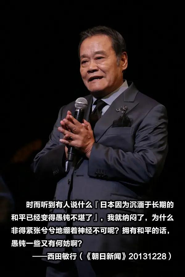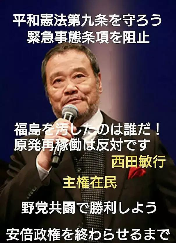 2016年初,西田敏行先生发声“捍卫宪法九条、阻止紧急事态条款”,并呼吁“在野党团结起来,共同终结安倍政权”,数日后由于“意外受伤”导致颈椎亚脱臼。