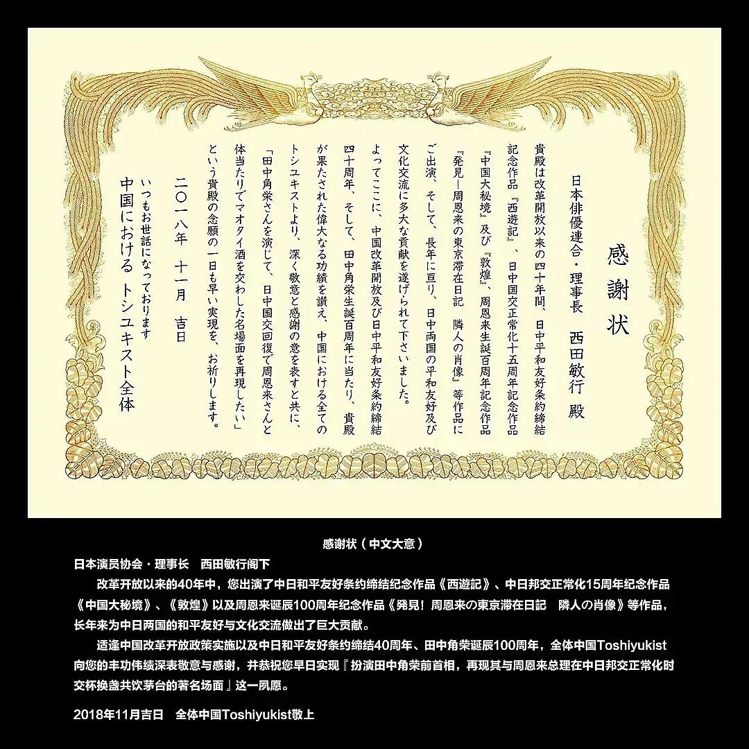 2018年适逢中日和平友好条约缔结40周年、改革开放政策实施40周年以及田中角荣诞辰100周年,以此为契机,近130名中国影迷众筹购买了一瓶当年周恩来总理与田中角荣前首相在中日邦交正常化实现之时举杯共饮的同款53°飞天茅台酒,由一位赴日旅行的小伙伴作为全体中国影迷的特使,于11月敏行先生71岁生日之际将这瓶茅台连同一张感谢状送到先生本人的手中,献上了全体中国影迷祈盼他早日实现“扮演田中角荣前首相,再现其与周恩来总理在中日邦交正常化之时共饮茅台的那一幕名场面”这一多年夙愿的满满诚意、以及对其在改革开放以来的四十年中为中日两国的和平友好・文化交流所做贡献的深深感谢。(点我查看详情)