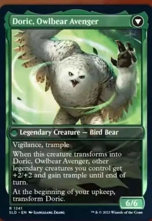 提夫林(万智牌中译为魔人)德鲁伊多立克,设计上引入了源自伊尼翠系列的模式双面牌机制(双面牌最早被用来模拟狼人)。翻面后的多立克会变成一只狂暴的枭熊。多立克的正反面都是典型的绿色牌风味:正面跳费翻面傻大兽。