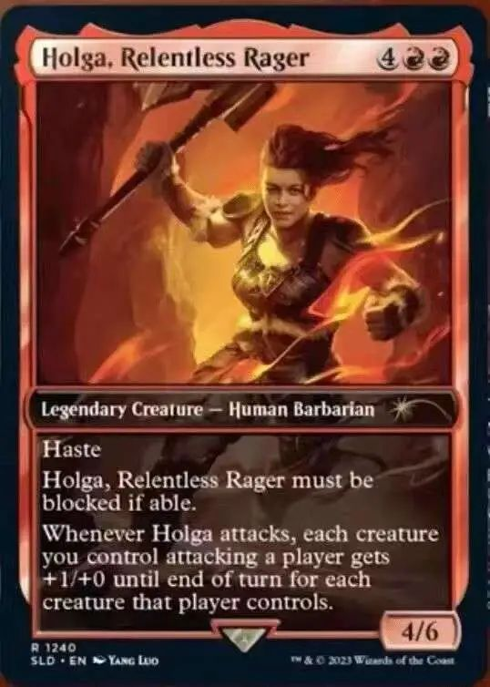 女野蛮人霍尔加的设计,在防守端体现了她MT的职业特色(能阻挡必须阻挡),而在进攻端又体现出她提振队友士气(为队友加攻)的队副定位。而万智牌中红色代表的鲁莽冲动,安排给她正正好。