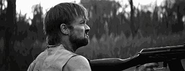 已经身中数弹的老爹同样坚强直立,双手托枪,不间断的朝儿子开枪。