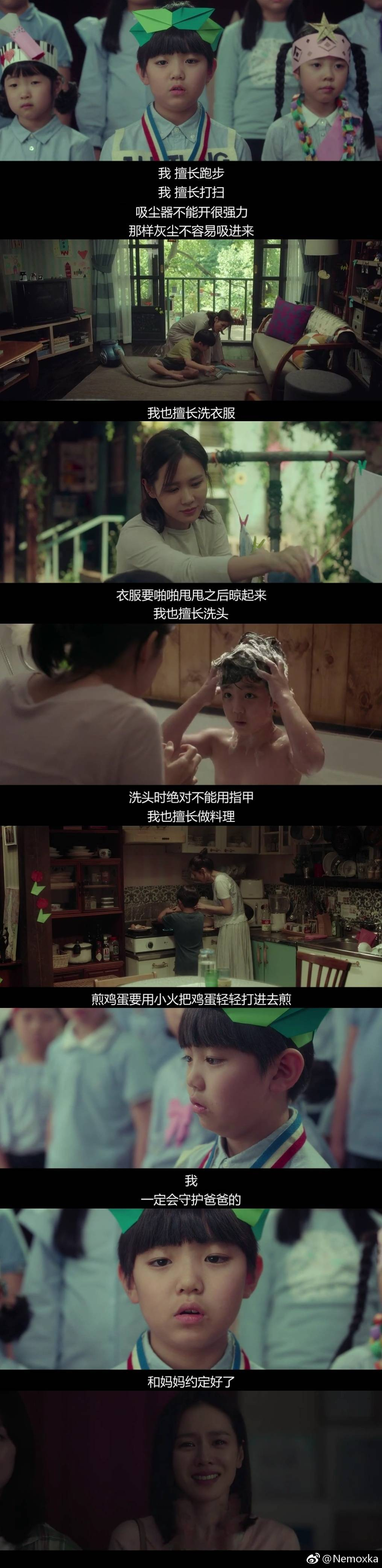 爱情,亲情,友情糅合在一起的一部电影。小男孩在台上说,“我最擅长的事,是清扫,是打鸡蛋,做煎蛋...。我还要守护爸爸,这是我和妈妈约定好的。”这一段真的没忍住在电影院哭到抽泣。