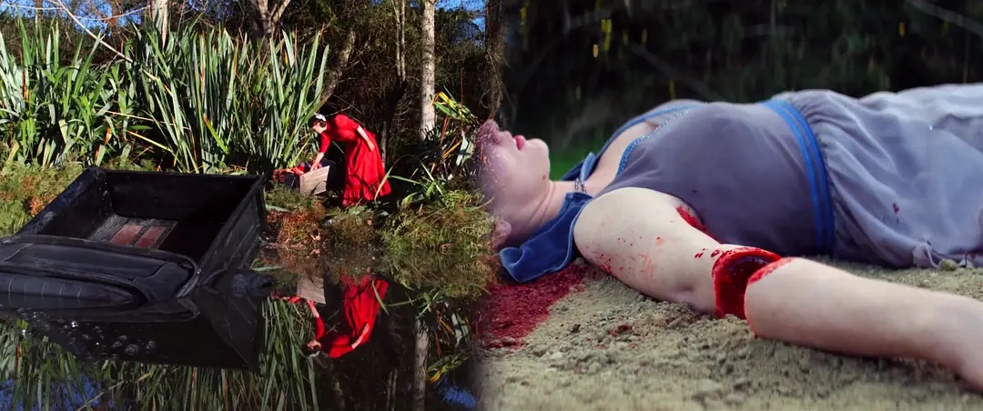 当然是致敬《闪灵》。侧面拍摄才会产生河流效果。本片不能自己生成邪灵化身的仪式,完全得借用经典来产生惊惧和联想。