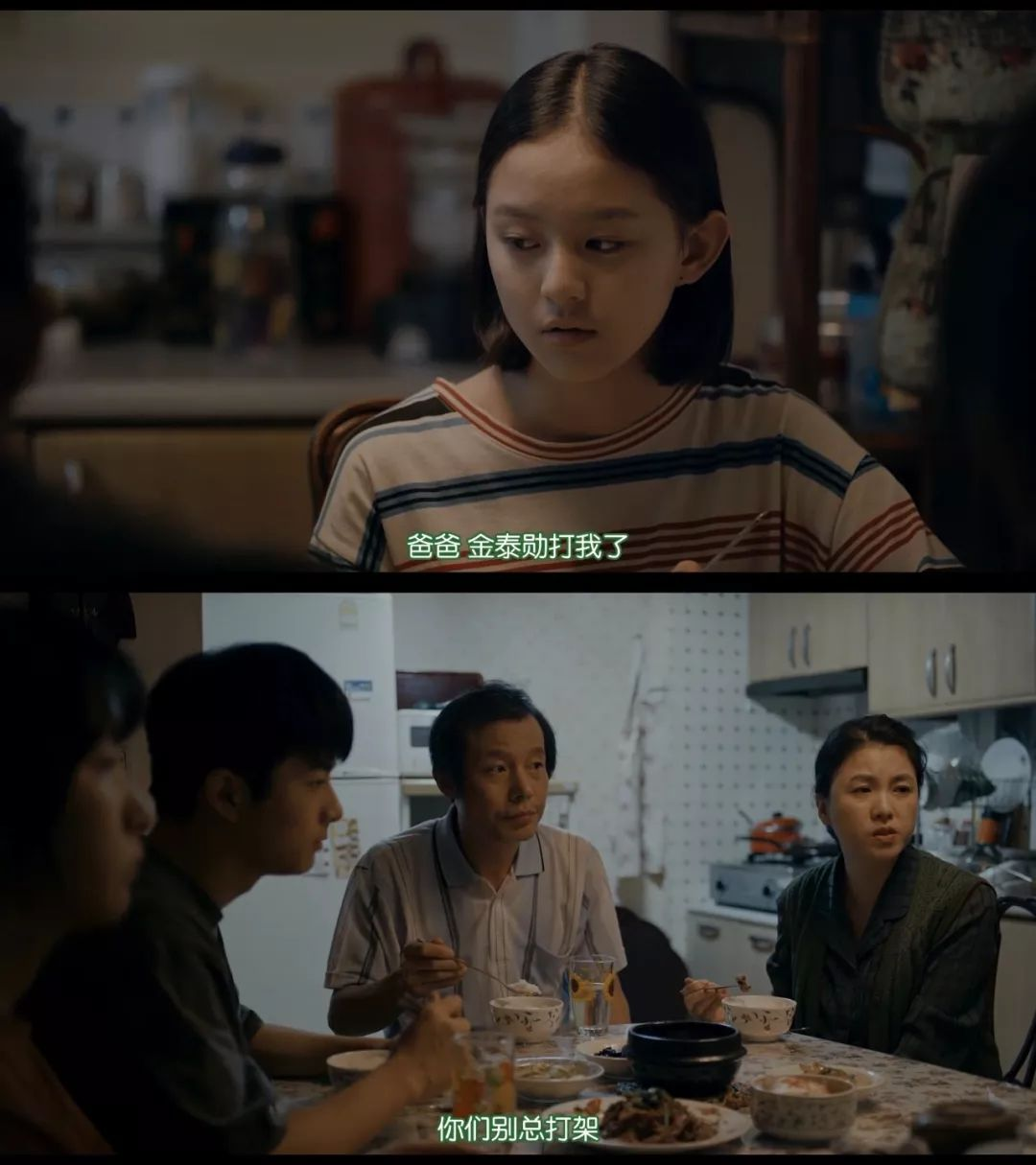 问题的根源还是在父母身上,尤其是父亲。n事实上,这是一个典型的为父权阴影所笼罩的家庭。 n表面看来没有一丝裂隙,内里实则布满数不尽的淤青。 n片中,泰勋虽然动不动就对妹妹耀武扬威,但在爸爸面前却始终低眉顺眼,一言不发。