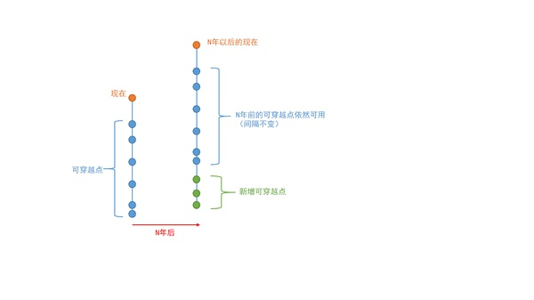 以往的影片都把时间线设定为一条或者几条平行的直线,这样会导出来一些有趣而复杂的结果。但是在本片里,时间旅行的设定被简化,避免了许多可能出现逻辑漏洞的地方。剧中的可旅行时间线是一条线段,这就意味着它有一个端点,而这个端点就是“现在”的时间。旅行的方式就是从端点旅行到线段内部的各个点,由于剧中是单一时间线的设定,穿越回过去会直接改变历史。时间线段会同时间一起流动,在此过程中,时间线段上每个点的距离是一样的,这就意味着每一次的时间旅行只能向前旅行一个固定的时间间隔,而不是回到某个准确的时间点。但是这也是说随着线段末端在时间轴上的前行,有些过去的时间将永远无法到达,因为会有新的可穿越点在线段末端的后面逐渐诞生,成为新的末端,就像我们玩的贪吃蛇游戏,蛇的身体会一截一截的变长。这样设定的好处在于,时间旅行者自己的时间轴和时间线上任意一点的时间轴是完全统一的,等于是简化了以往同类电影谜题一般的时间轴,观众在欣赏本剧的时候会非常轻松。