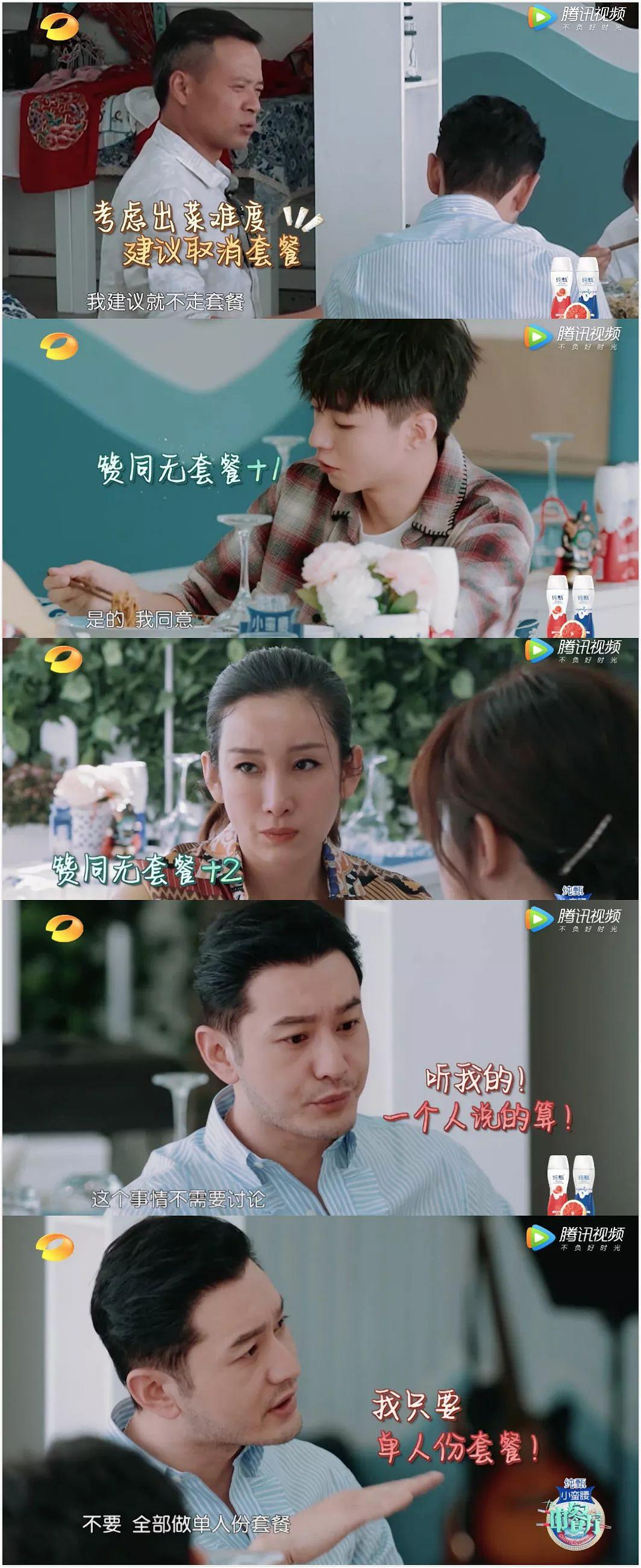 大厨再三解释,单人套餐只会增加后厨的工作量和出菜难度,其他人也都同意,黄晓明就摆出店长架势,一人坚持单人餐。