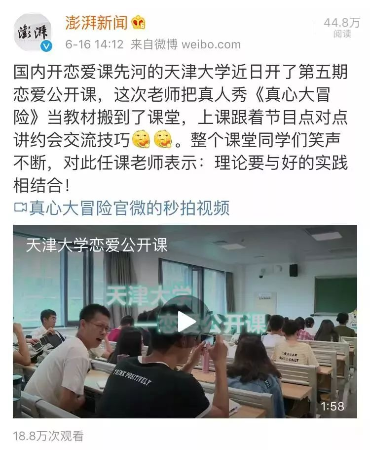 一个有趣的事件是,于2015年在国内高校首开《恋爱学理论与实践课》的天津大学,这学期将《真心大冒险》作为教学案例在课堂上使用。