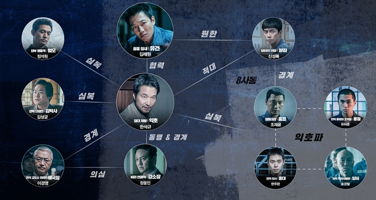 它在豆瓣上的概要是这样的:「金来沅饰演的刑警因为弟弟被犯罪团伙所害,为了查清事件真相,以囚犯身份进入监狱,接近在监狱里称王称霸的人物。而韩石圭饰演的监狱霸主因为和政府高层有着某种交易,在监狱里也能一手遮天。」