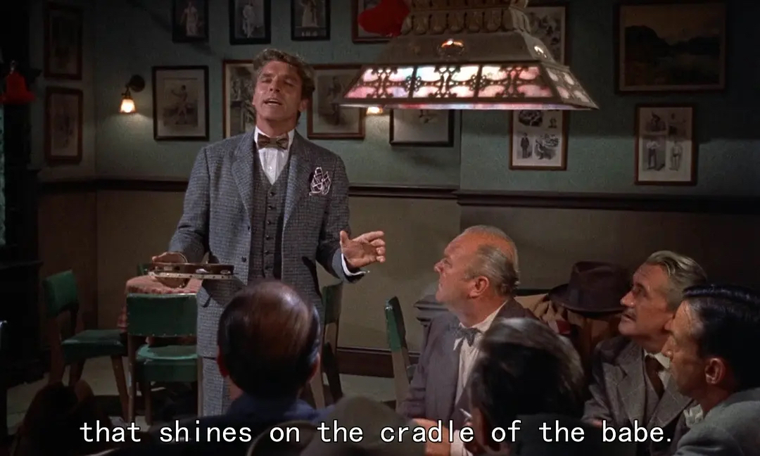 圣诞前夜。电影在酒鬼淫荡的笑声中幕启,我们看到本片第一个镜头,那是表现耶稣降生在马槽里的一个饰品的特写;同时,我们也听到本片第一句台词,那是甘特里给醉鬼讲的黄段子。