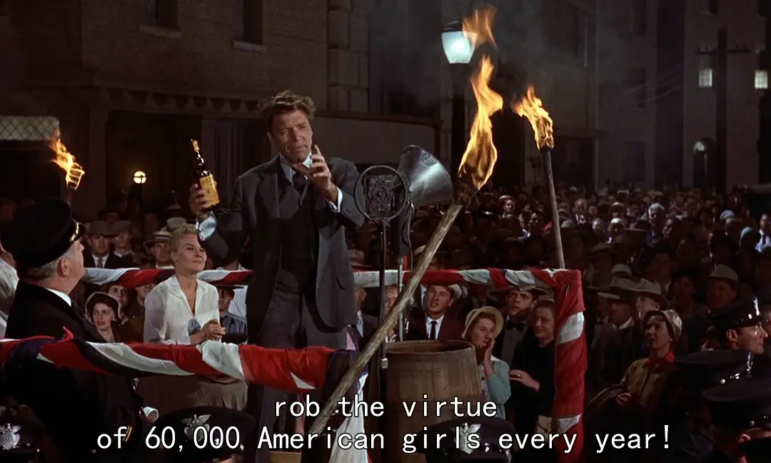 同样,甘特里的名字亦风生水起,从不名一文的推销员真的做到了“有十四州的人直呼我的名字”。他在席纳斯城体育场演讲时,导演适时使用了仰角拍摄,甘特里俨然一个邪教头子。他随之掀起市民久违的宗教仇恨,簇拥着他去捣毁那些有罪的地方如酒馆、妓院。似乎早已忘记了他也曾是酒馆赊酒的常客,更曾经抛弃过他在堪萨斯神学院诱拐的那个叫做露露的女子。于是,大批信众唱着中世纪十字军出征的战曲《前进吧,基督战士!》,狂热不减当年,更不吝以道德之名义行残忍之事,他们手持棍棒捣毁酒馆,毫不留情的逮捕妓女。分明忘记了基督的教导是宽容。