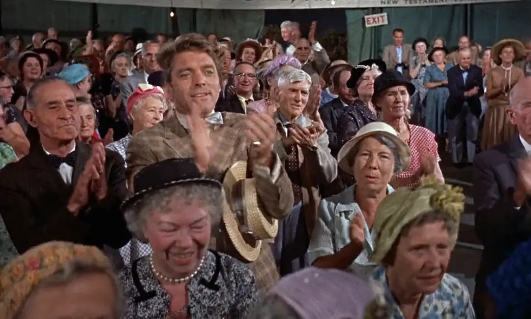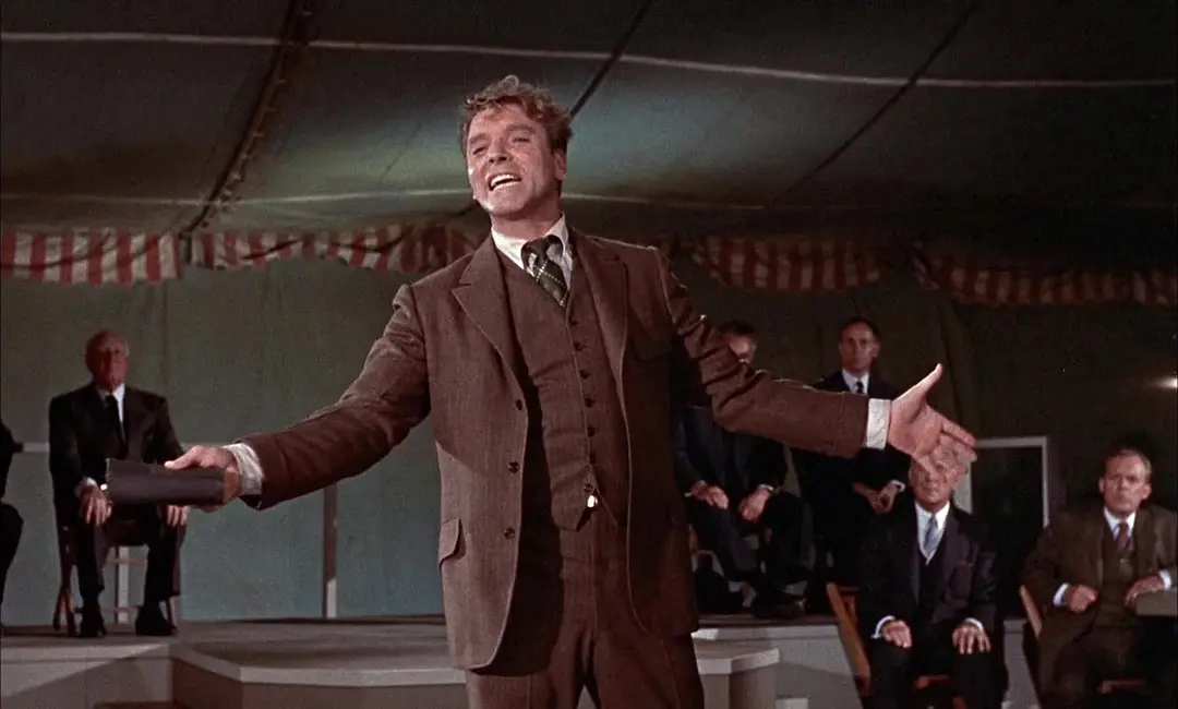 《孽海痴魂》一片,是布鲁克斯改编美国作家刘易斯的同名小说。这位刘易斯在今天恐怕只有专修英美文学专业的人才知道是谁,但在二三十年代,他可谓红遍密西西比河南北,因为他是美国有史以来第一位诺贝尔文学奖获得者。刘易斯以纪实性著称,语言风格颇似报告文学。如刘易斯笔下的《孽海痴魂》,是一部揭露“信仰复兴运动”虚假本质的小说。打个不算恰当的比方,就像今天一部揭露传(我很敏感)销的报告文学。而布鲁克斯将此片搬上银幕的1960年,刘易斯已过气,那么他改编这部作品的动机何在?