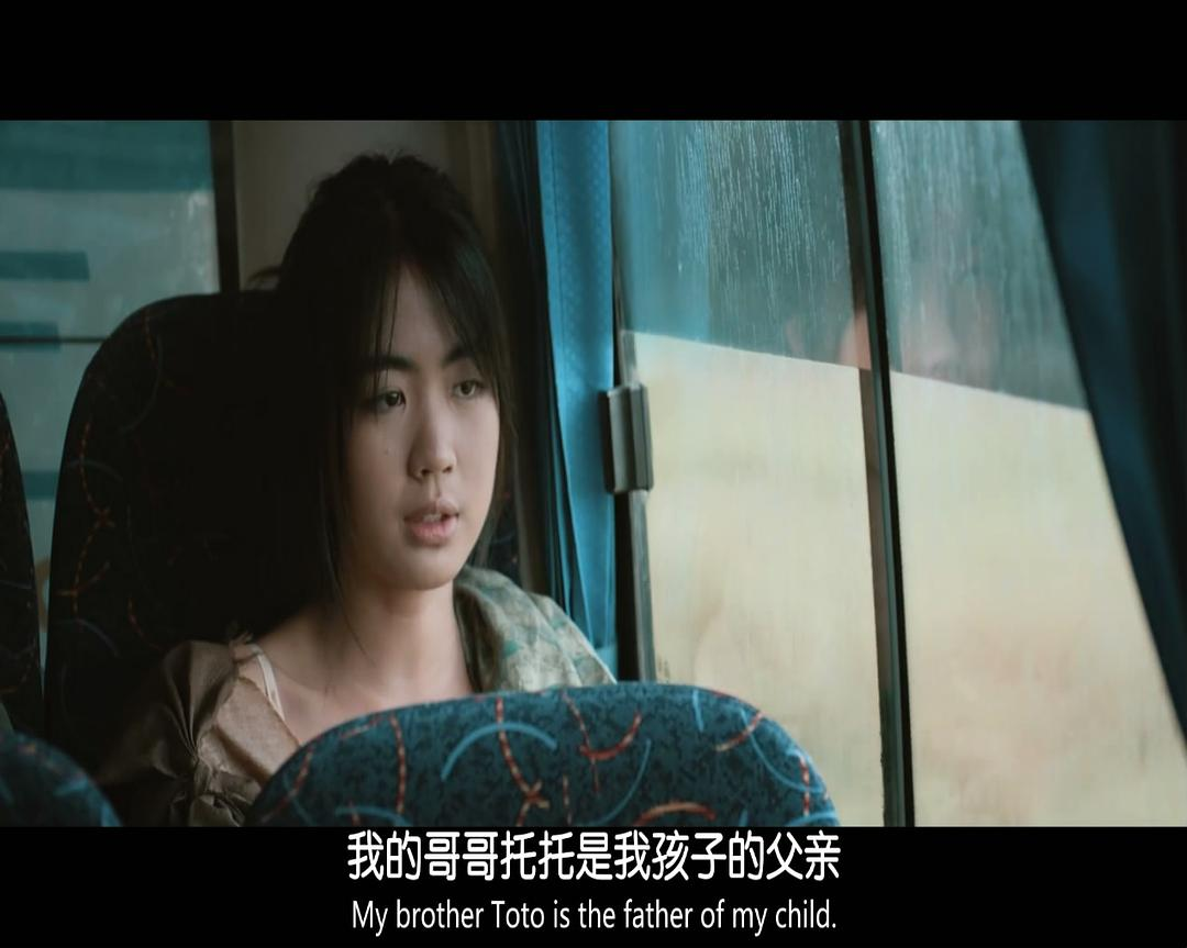 这段是通过女主的讲述呈现的,影片使用插叙来交代剧情,剧情线不多,就两条,一条是按时间正叙、只是隐去了船上的遭遇,在影片前段你只能看到女主风尘仆仆在赶路、而不知这朴素的表面下已经惊涛骇浪!船、出租车、巴士,铺垫了第一条线的基本框架后,第二条剧情线从巴士上男女相遇徐徐展开……此时你我和巴士哥都是听故事的人、女主继续讲到她怀孕后被送回老家、生下幼儿不久后便从受灾的家乡出走寻找哥哥。不幸童年、禁忌伴侣,当怀抱禁忌之子、穷困潦倒的她出现在路上,此时她就是个诱人而可怜的女人!为什么她可怕呢?因为……重大剧透!!因为片末揭晓的、女主根本没有孩子,她的宝宝早就夭折……而她“精神错乱”!失去孩子的女主得了抑郁症,从灾难中混乱的医院抱走了一名新生儿,你看她片头慌张上船是因为逃票,更是因为偷孩子!