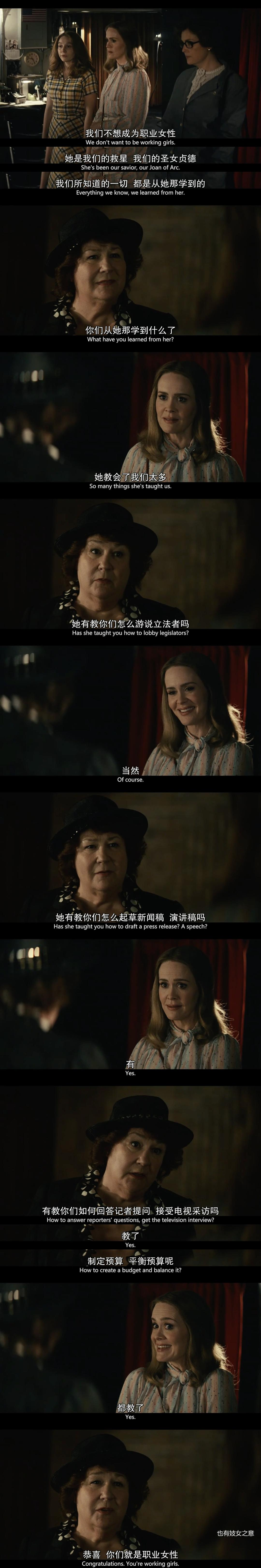 Phyllis的自相矛盾。她反对ERA的行动是建立在维护男主外女主内的家庭制度基础之上,然而她踏入政坛、闻名媒体、控制丈夫和孩子时又难掩野心。这也是为什么在两对夫妻辩论中她漏洞百出的原因。二元的传统价值观经不起推敲。