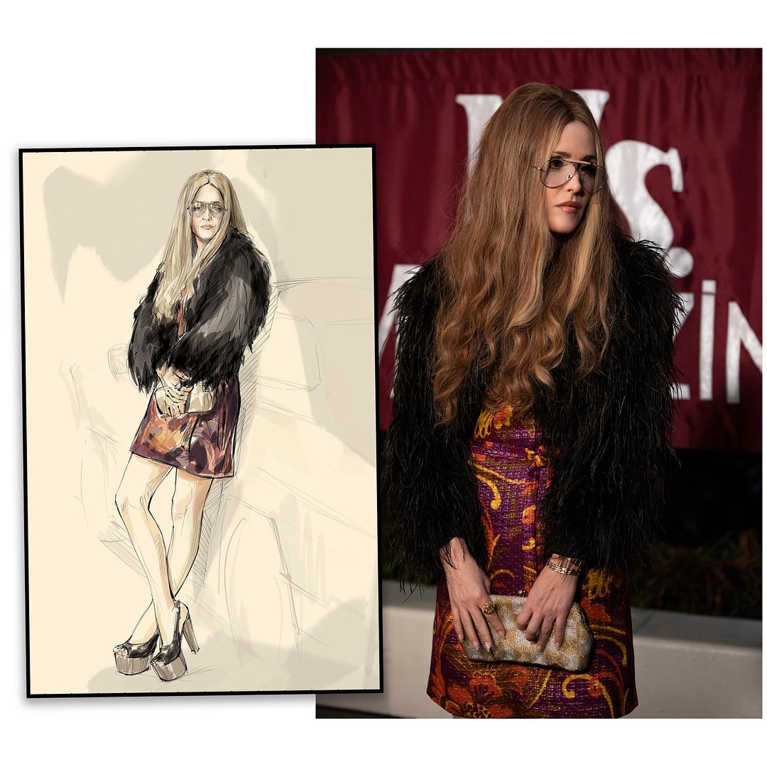 服装师甚至在Etsy(美国电商平台)上淘到施拉夫利1982年出席晚宴时穿过的一条极具未来风的多明尼加时装品牌Oscar de la Renta长裙(剧集宣传海报上的那一条),并将它移用在了1979年那场著名的“ERA死亡宴会”上。