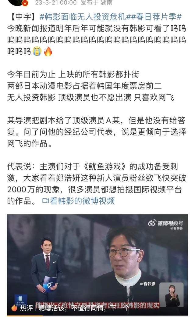 现在没有人愿意投资韩影,顶级演员也不愿意出演,大家都去参演网飞剧。