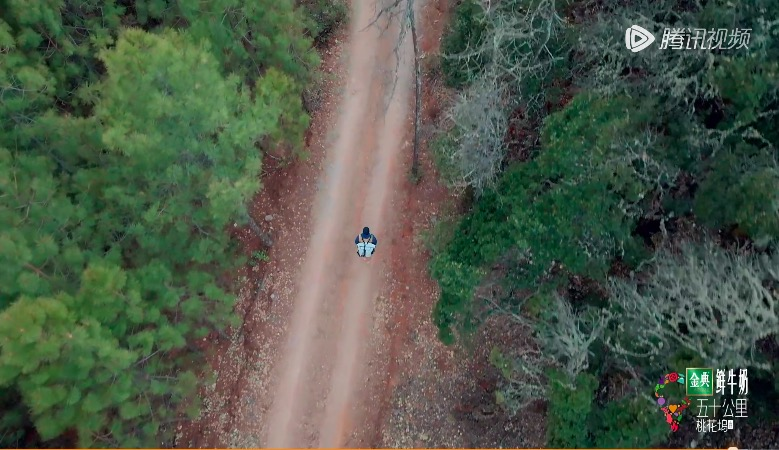大王一个人背着背包,一路步行上山了。他穿着深蓝色的罩衫、土黄色的马甲,背着浅灰的背包穿行在山间土路上,身型伟岸如大王在森林、雪山、蓝天面前也是小小的一只,并且恰如其分的、和谐的融入到了整个景色中。