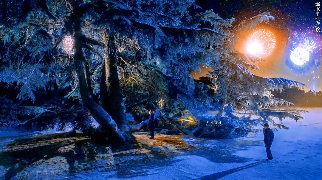 看到公子在跨年倒数中亲吻身边的人,碍于身份无法亲吻所爱之人的王子红着眼转身离开。公子追到雪地里,白雪如白沙,高高雪松如椰树,在漫天烟火的掩映下,第一个吻即将发生。这处构图也很美: