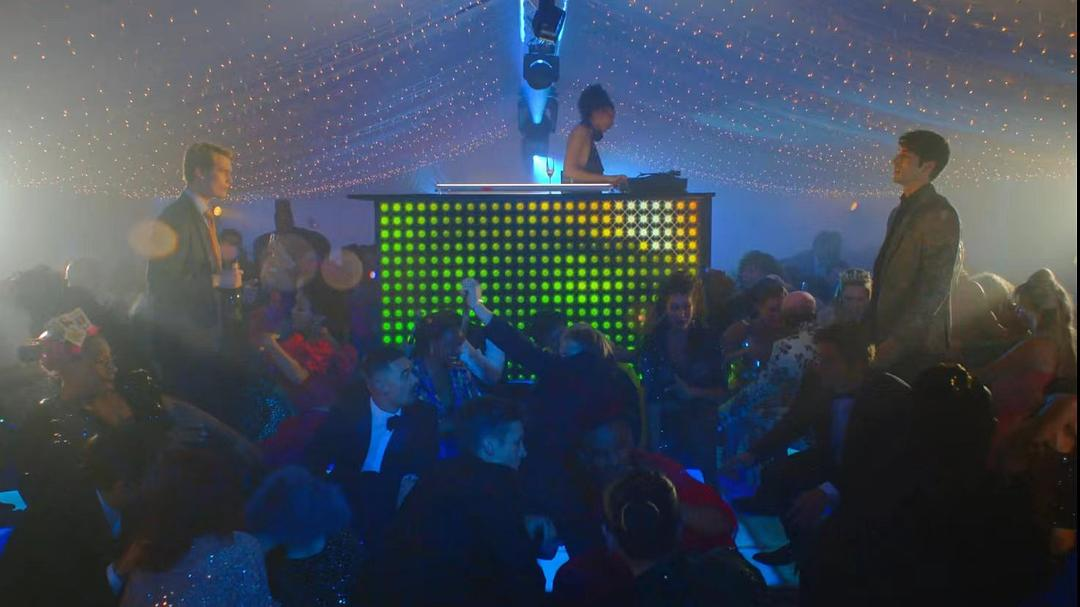 在跨年夜的party,舞池所有人随着音乐蹲下,只有不熟悉派对音乐的王子和凝望着王子的公子在千万人的狂欢中望向彼此,仿佛全世界就此消失,只剩你我对望。颇有那人竟在灯火阑珊处的氛围: