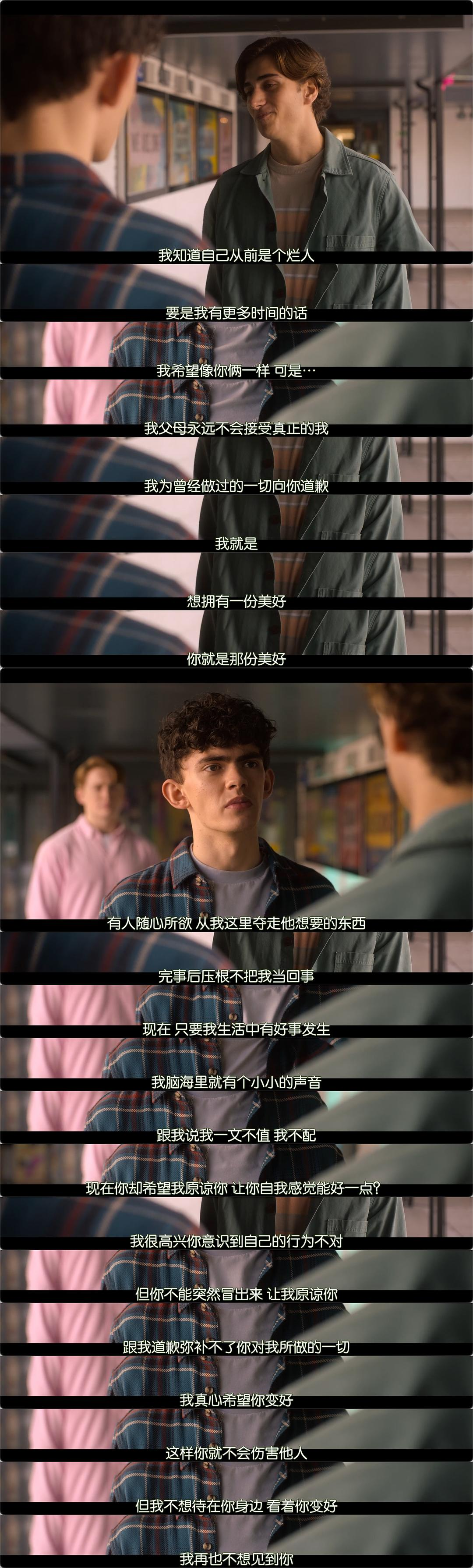酷儿的亲密关系中同样可能存在诸如情感勒索、道德绑架、精神控制、甚至暴力等行为,而这些隐秘的伤害又因为酷儿的身份而更难向人倾诉,受害者甚至可能会出于拯救情结而去不断包容加害者,这种毒素会慢慢侵蚀受害者的自我价值,而加害者的道歉并不能瞬间消除这一切,受害者需要付出漫长的时间和努力去慢慢康复。所以 Charlie 对 Ben 说的那番话实在是非常解气,相信经历过有毒关系的酷儿都深有同感,我们真的不欠烂人一个原谅。