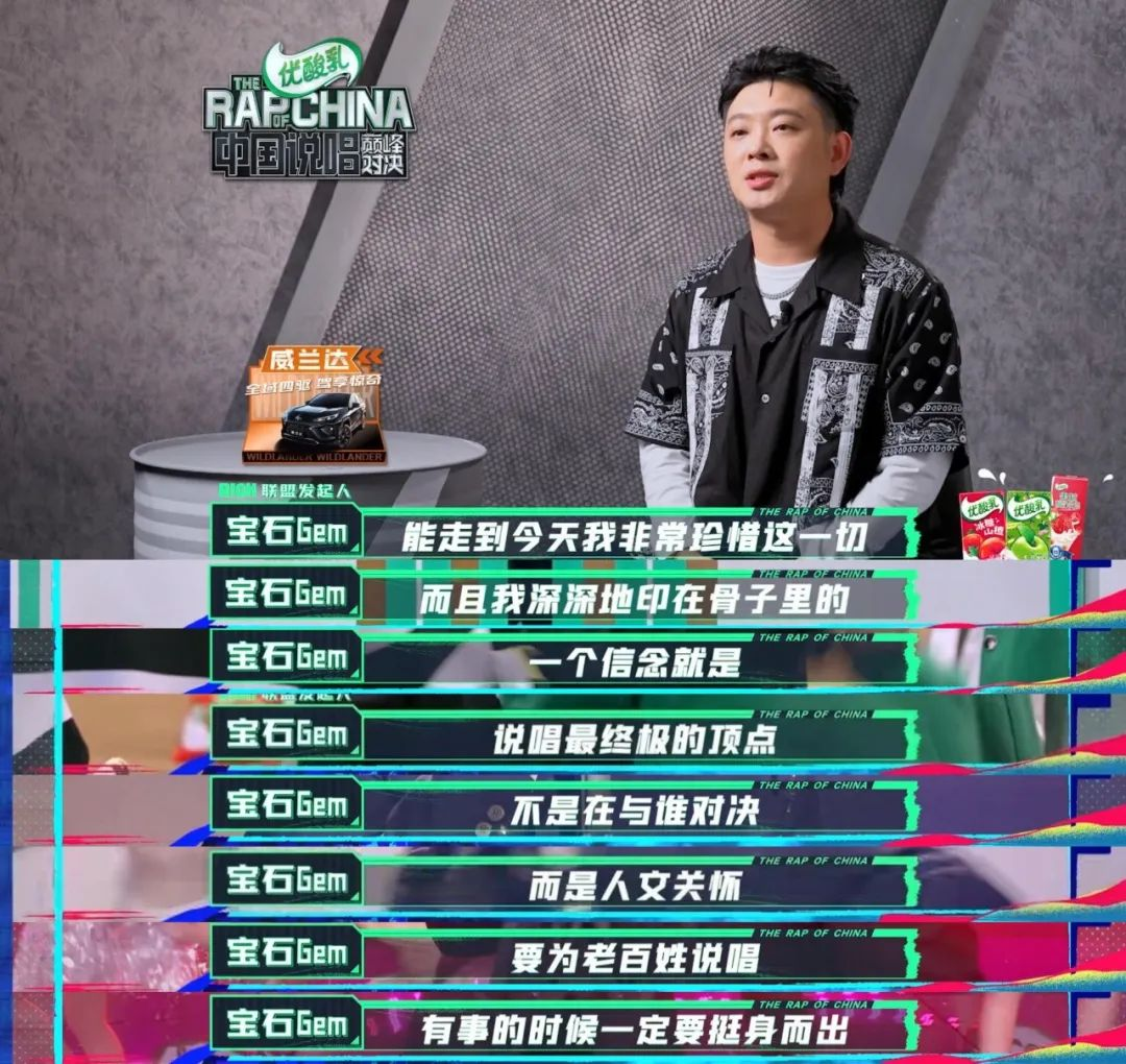 “能走到今天我非常珍惜这一切,而且我深深地印在骨子里的一个信念就是,说唱最终极的顶点不是在与谁对决,而是人文关怀,要为老百姓说唱,有事的时候一定要挺身而出,多写好歌”。